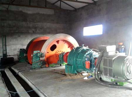 井塔式提升機 機房設(shè)在井塔頂層,與井塔合成一體,節(jié)省場地;鋼絲繩不暴露在露天,不受雨雪的侵蝕,但井塔的重量大,基建時間長,造價高,并不宜用于地震區(qū)。